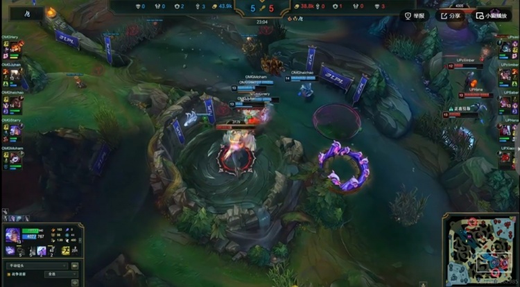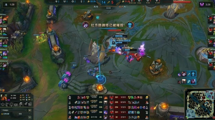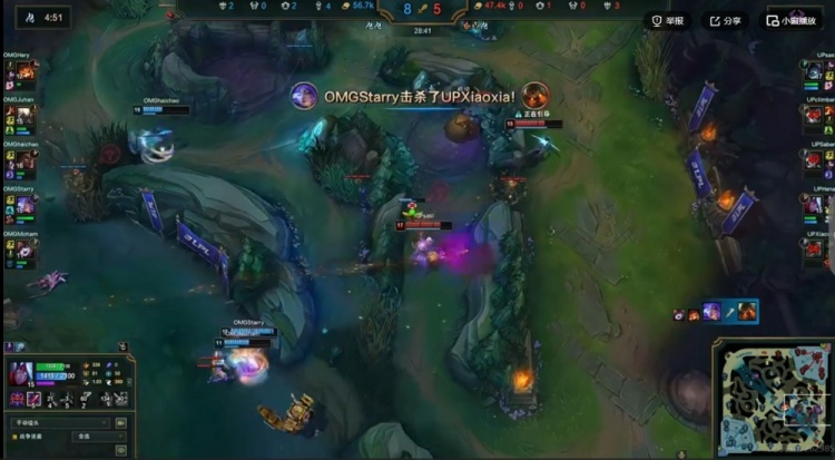 31分钟OMG在4-1分推,UP想中路强开但是Xiaoxia泰坦出钩之后自己根本活不下来啊!带着复活甲的Juhan潘森毫无压力,进场罩大的Saber阿萝拉也直接被梅尔秒了!OMG团灭UP一波结束比赛,先拿一分!