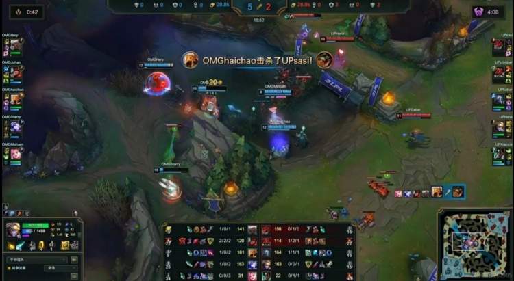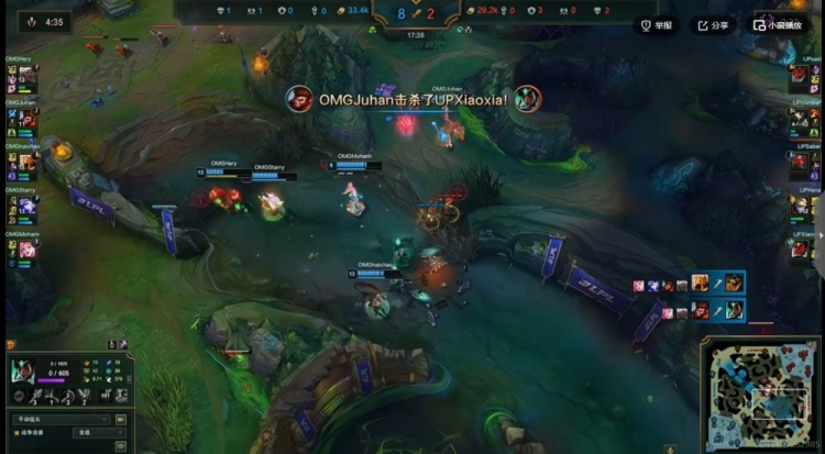 第二局比赛双方开局平稳发育,UP下路线权先拿一条小龙!随后四人河道强杀Juhan猴子,一血给到了Saber维克托!10分钟UP再拿第二条小龙,前期双龙+三虫全部到手!不过随后的三分钟OMG连续主动找节奏,相当于打了个1换3,自己队伍还能反超经济!