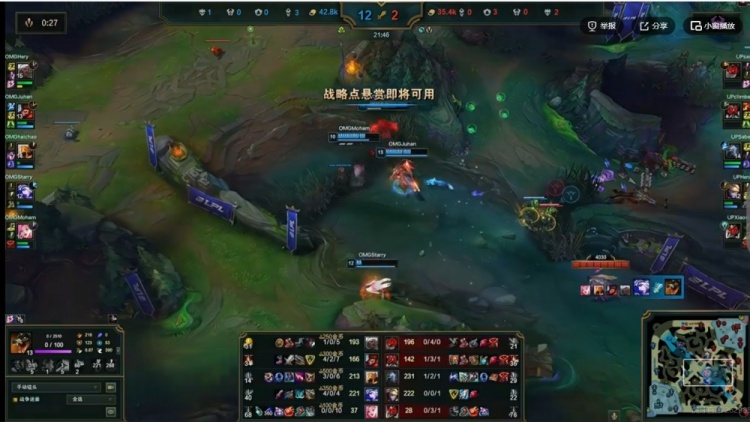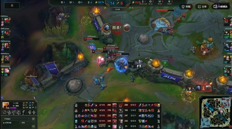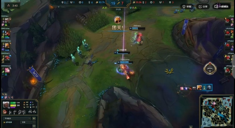 20分钟OMG四人上路再次逮捕sasi鳄鱼,随后21分钟河道团Juhan猴子被开但是死不掉!haichao沙皇开戳拉满输出帮助Starry艾希双杀,这波OMG又是0换3,转上路拿下大龙!8K多经济差了!