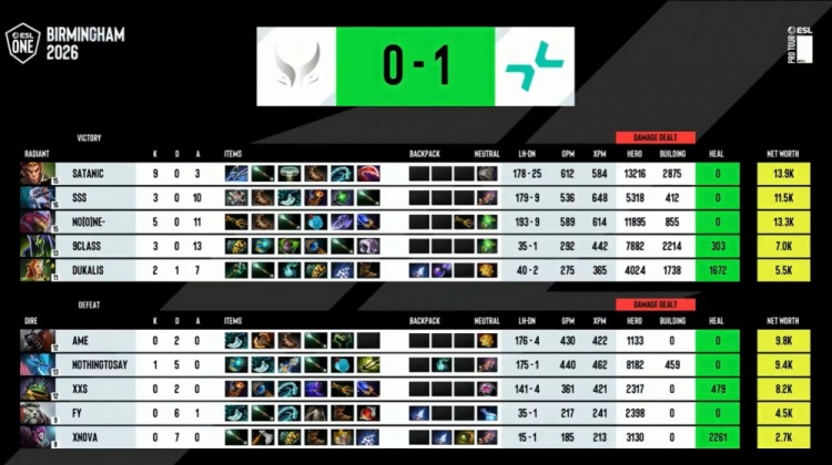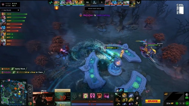 第一局前期xNova戴泽上路被9Class拉比克击杀送出一血,随后9Class再来中路联手No[o]ne滚滚拿到NTS拉席克人头。森哥海民中路变球撞飞Dukalis小鹿,但No[o]ne抢符杀掉森哥,PV打出1换2经济领先2k。