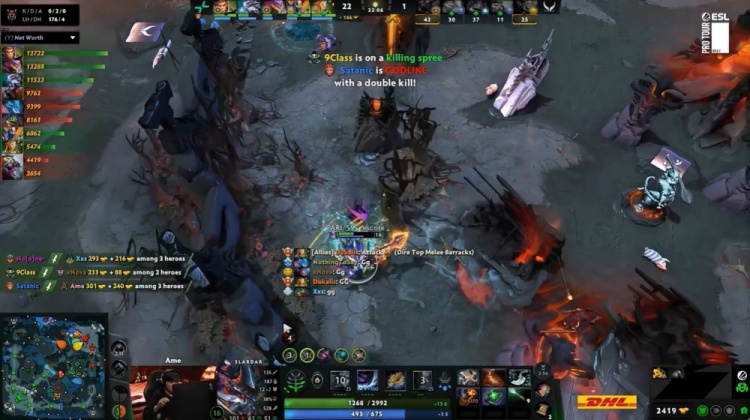 【9:24】下野区团战,NTS残血老鹿被SSS大鱼砍掉,XG众人急忙撤退,PV经济领先5k,三大哥经济分列一至三位。