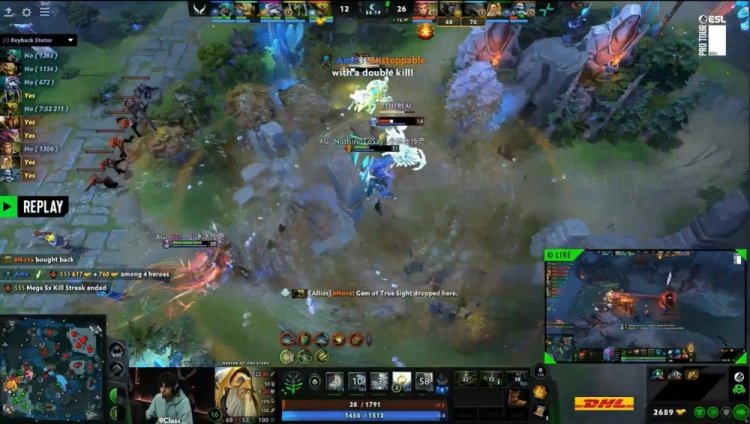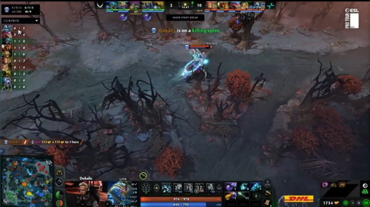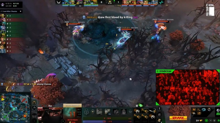 【0:39】开场X哥大鱼一直被PV三人尾随到上路,9class光法配合Dukalis巫妖夹击拿到X哥一血。