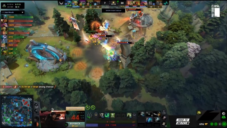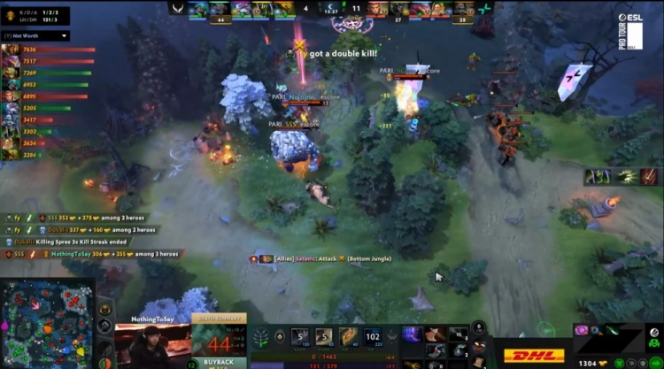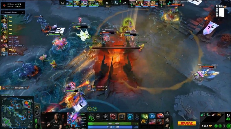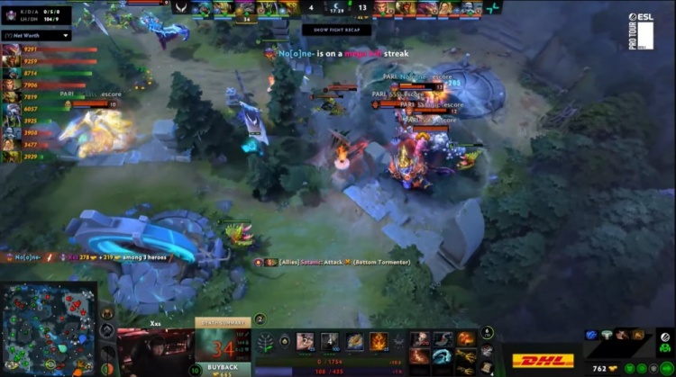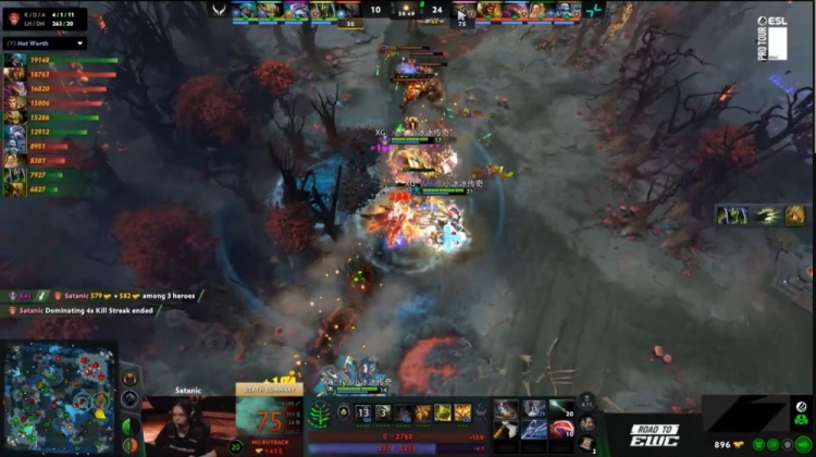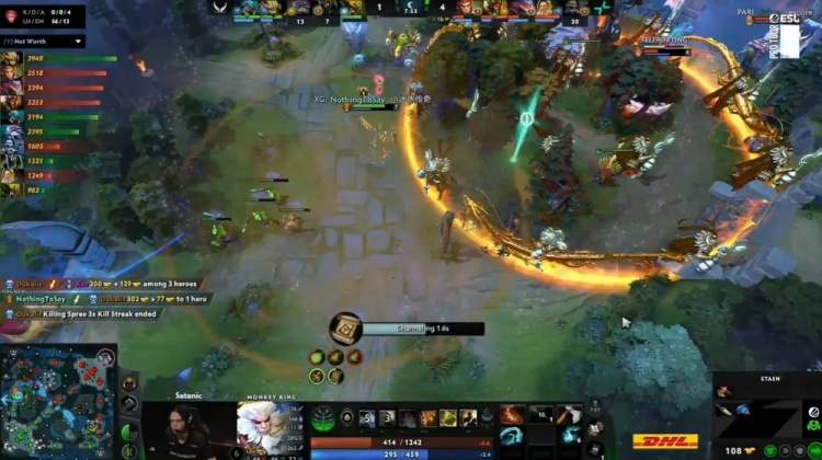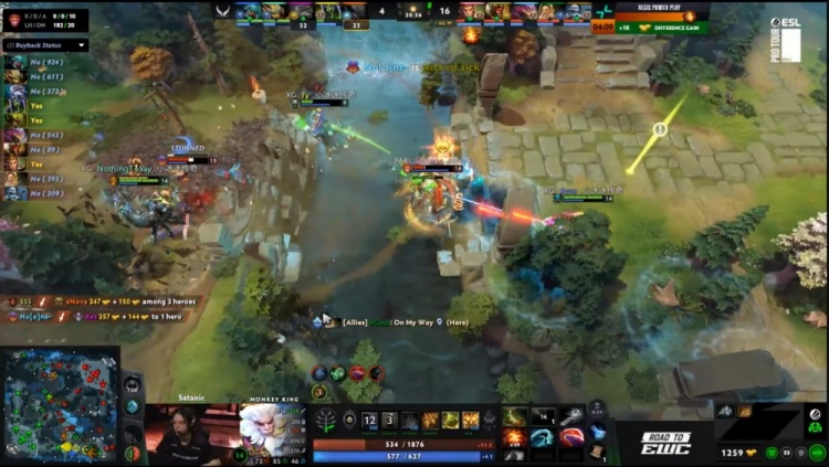 【23:02】下路小吃街前Satanic大圣开大,Dukalis巫妖被哥哥与X哥包夹致死,XG众人追击,哥哥蚂蚁击杀9class光法后撤退,noone滚滚击杀X哥,森哥被Satanic追杀致死,NTS中路抢符被Satanic大圣跳树一棒带走,PV打出2换4,经济领先6k。
