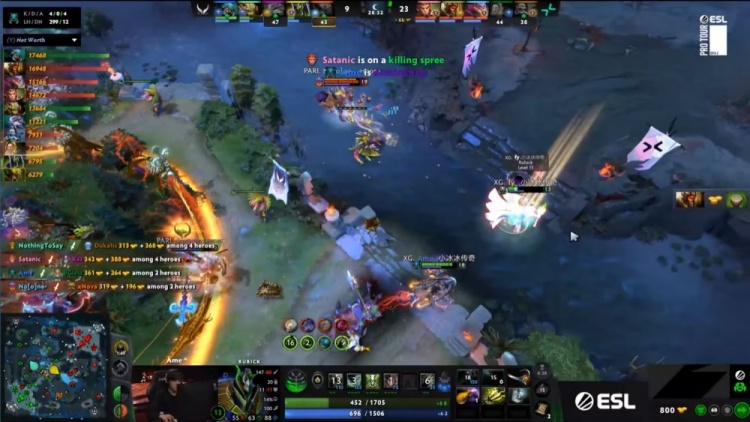 中期下路小吃街团战PV打出2换4经济领先6k,随后XG五人开雾抓人,X哥大鱼晕三人,Dukalis被NTS沙王秒掉,双方2换2,PV推掉XG中路二塔经济领先7k。