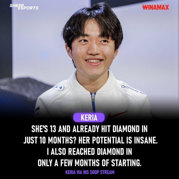 Keria:“你才13岁,你现在的潜力简直高得惊人。但等到你出道的时候,那还太遥远了?我刚开始几个月才达到了钻石级别,你知道吗?你可是世界级的!”