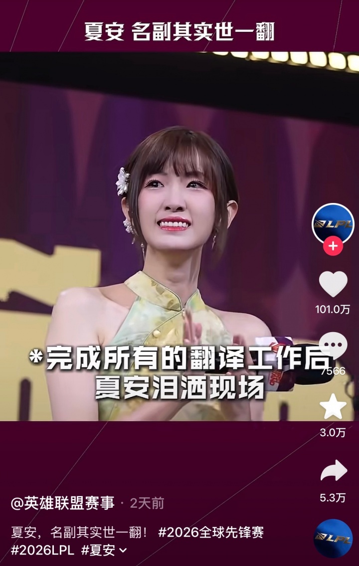 直播吧3月29日讯 近日英雄联盟官方抖音发布了主持人夏安在先锋赛BLG夺冠后的采访画面,由于夏安在现场的翻译能力让网友一致好评,该视频的点赞数成功破百万!