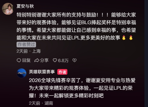 主持人夏安也在该抖音的评论区感谢网友的支持:特别特别谢谢大家所有的支持与鼓励!!!能够给大家带来好的观赛体验,能够见证BLG捧起奖杯是特别幸福的事情。希望大家都能做让自己感到幸福的事,也希望能和大家在未来共同见证LPL更多更美好的故事