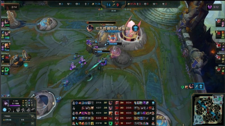 最终OMG强吃大龙得手,中路团战,haichao沙皇推两人双杀后再杀Zhuo璐璐拿到三杀,OMG打出1换5团灭NIP,一波推平基地先下一城。