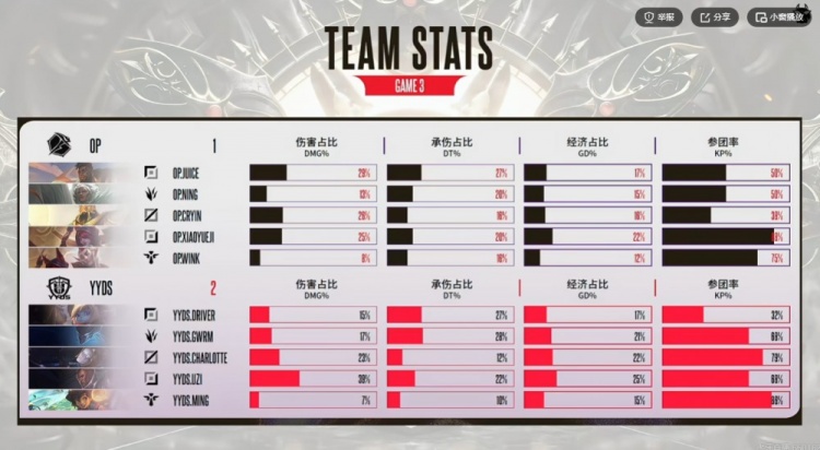 OP:上单Juice,打野Ning,中路Cryin,下路xiaoyueji,辅助Wink