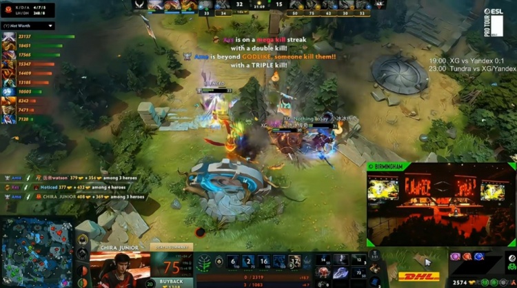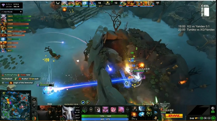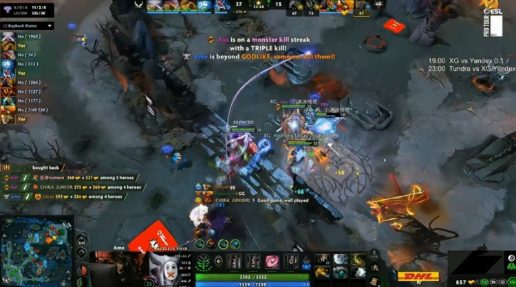 【30分钟】XG拿下魔晶之后抱团,传送门结果被Yandex抓了个经济差开团!XG双酱油被秒但是Ame虚空罩大直接打掉了凤凰蛋还留住了开大的watson奶绿!残局3V3,XG这边有滚滚+钢背双减甲Yandex根本打不过啊!最终Ame虚空GODLIKE的三杀收尾,XG团灭Yandex,拆掉下路高地!回头再拿肉山!Ame虚空带盾!