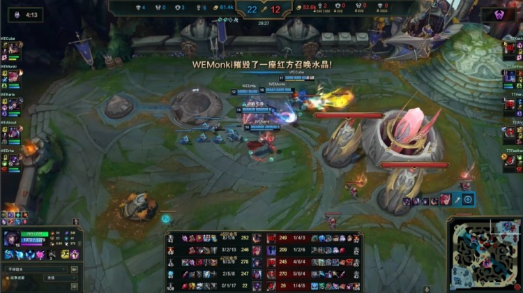 龙魂团,Monki蔚冲拳被拉扯,Karis妖狐游龙三杀,WE打出1换3,拿到水龙魂,经济领先5k。