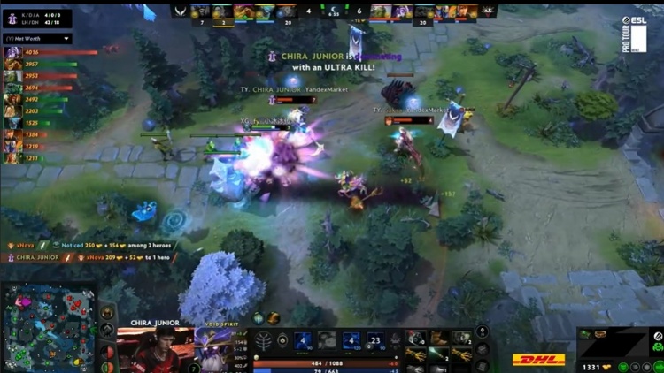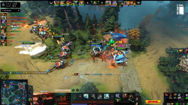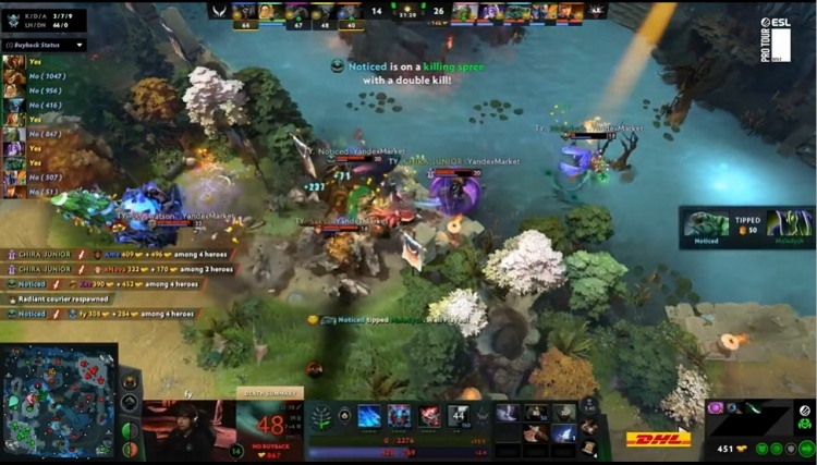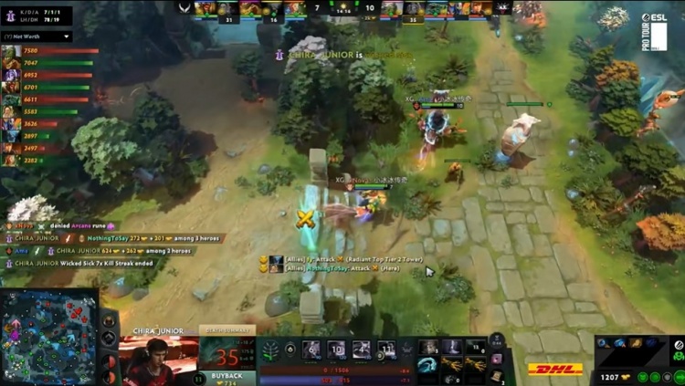 【6分钟】下路Noticed潮汐动手Ame兽王,XG选择与潮汐硬刚,fy裂魂人冲过来救人失败,眼看潮汐不到三分一血,NTS光法也过来帮忙打潮汐,没想到潮汐皮那么厚,一直拉扯没有阵亡,反而是极速符过来的CJ紫猫游龙起来,将XG的人来一个杀一个,早早阵亡的兽王复活过来好不容易击杀了潮汐,但是NTS光法被紫猫击杀,连xNova小鹿也连死,XG被打一波团灭,紫猫收下四杀,差点暴走,Yandex瞬间将对线落后的经济拉了回来。
