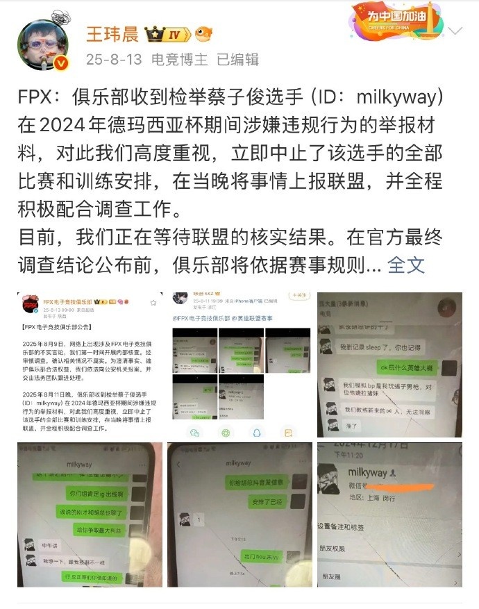 去年8月13号FPX公告说接到对Milkyway的举报,于是中止了他的比赛和训练。