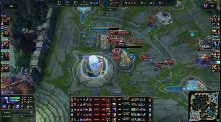 首局比赛就是AL完全的一边倒,比赛早早进入垃圾时间,TES在23分钟才依靠Creme的沙皇拿下两个人头避免被零封。最终首局比赛的人头比为27:2。
