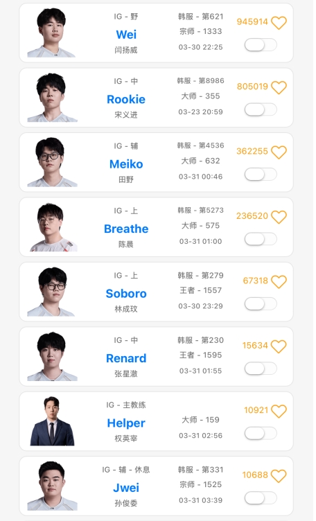 直播吧3月31日讯 EWC预选赛iG不敌WBG,赛后iG首发选手们全员登上韩服账号打Rank寻找手。