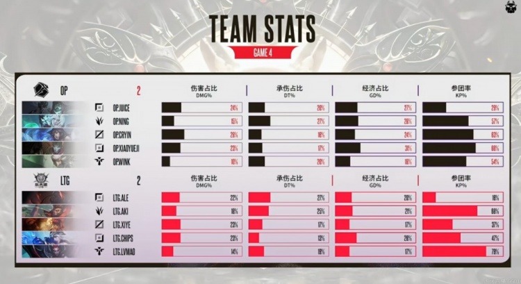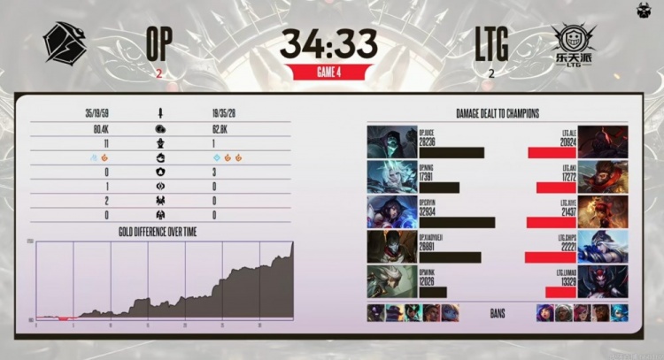 15分钟OP拿下先锋,但是Ning佛耶戈中箭被秒,LTG追击再留xiaoyueji烬,打出0换2还了一波!19分钟wink青钢影先手配合队友打出0换2,OP拆掉对手下二塔重新拿回5K经济优势!21分钟中路团Ning佛耶戈向死而生,交闪向前强行双杀帮助队伍打出2换3!23分钟LTG拿下小龙,但是Cryin阿狸RE闪魅惑配合队友秒掉了chips艾希!残局没人管的Juice约里克三杀,OP团灭LTG可以拿下大龙!快一万经济差了!