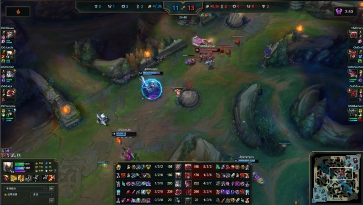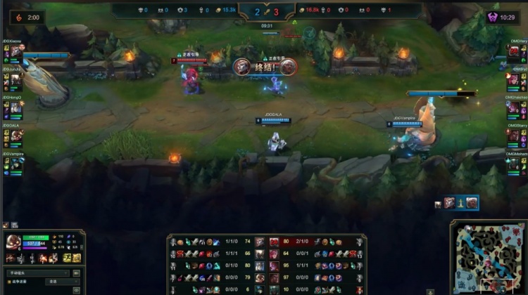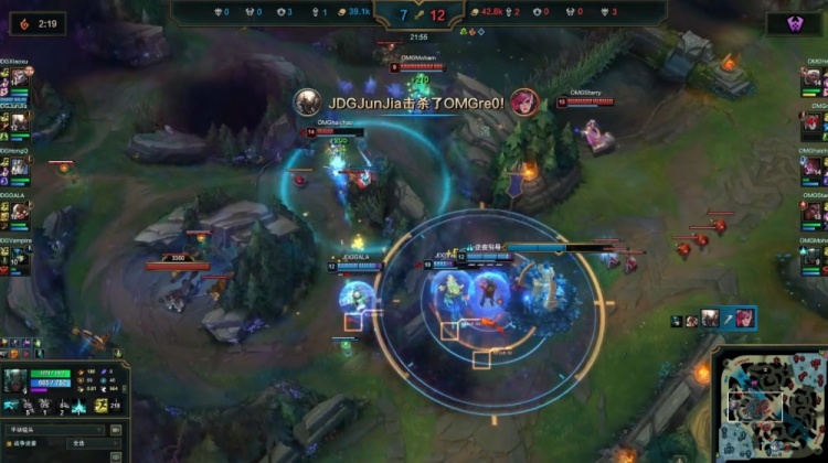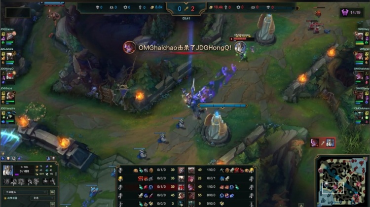 最终OMG入侵JDG下野区,haichao阿萝拉斩掉JDG双人组,OMG打出2换5团灭JDG推平基地扳回一城。