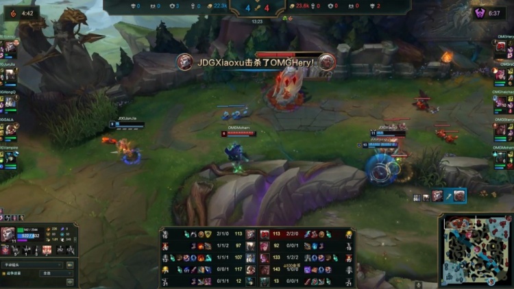 【13:23】上路混战,Hery安蓓萨率先倒地,Moham派克上路斩空,但徐神亚恒与hongQ加里奥被杀,OMG打出1换2。