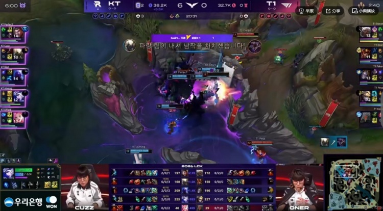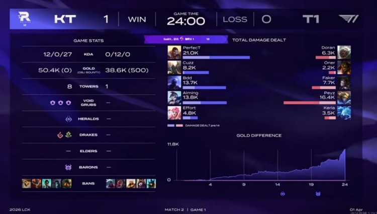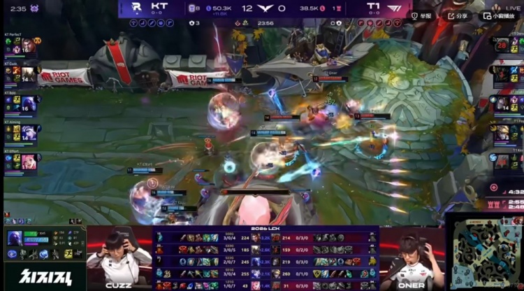 首局比赛Doran安蓓萨直接被PerfecT杰斯单杀送出一血!下路和中路对线也没打过!随后Cuzz潘森连续带起节奏抓到T1双C,KT前期资源全拿毫无压力!中期T1全是短手面对对手毫无抵抗之力,20分钟Keria冰鸟配合队友抓单被反杀,KT拿下大龙之后局势已定!最终KT下路团战轻松获胜,最终以12-0的击杀比零封T1结束掉首局的比赛!