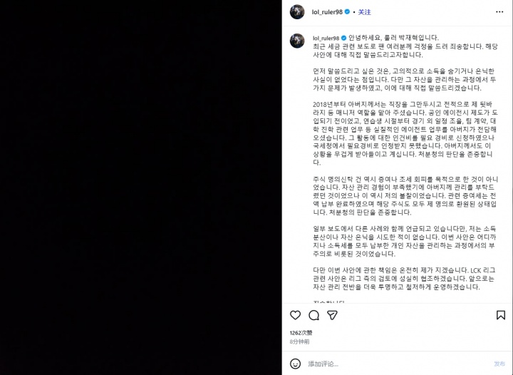 虽然部分报道将此事与其他案例混为一谈,但我从未试图分散收入或隐匿资产。本次事件纯粹源于在管理已全额缴纳所得税的个人资产过程中的一时疏忽。 不过,关于本次事件的责任,我将全权承担。对于LCK联赛相关事宜,我将诚恳配合联赛方面的审查。今后,我将更加透明、彻底地管理所有资产。