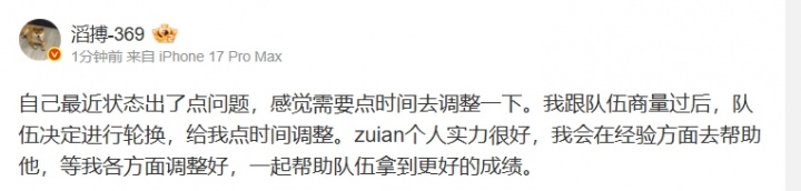 自己最近状态出了点问题,感觉需要点时间去调整一下。我跟队伍商量过后,队伍决定进行轮换,给我点时间调整。zuian个人实力很好,我会在经验方面去帮助他,等我各方面调整好,一起帮助队伍拿到更好的成绩。