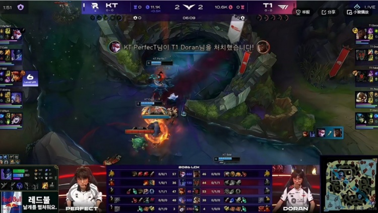 【6:02】上路河道遭遇,Cuzz梦魇+Bdd安妮依靠先到的PerfecT薇恩直接三人集火逐个击破!打了T1一波0换3!但是随后Faker岩雀复活开大抓下,配合队友逮捕了没闪的KT下路组,还了一波0换2!