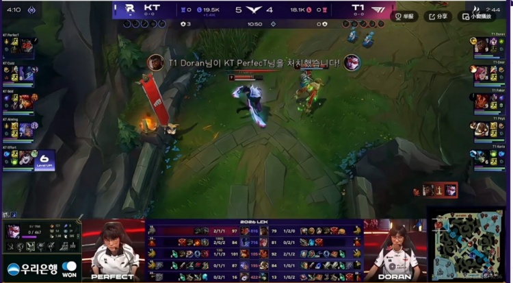 【10:52】Faker岩雀开大绕后,强行帮助Doran奎桑提击杀掉了PerfecT薇恩,补回了经济!
