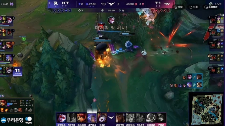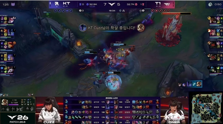 【18:34】KT上中两路同时发力!上路Bdd安妮砸大直接对位单杀Faker岩雀!同时没闪的Peyz库奇被Cuzz梦魇贴脸飞瞬间被秒!KT拆掉中一塔!