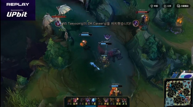 【5:58】下路对拼,Lehends冰鸟卡位配合队友留住了Career牛头,一血给到了Taeyoon维鲁斯,NS还可以拿到第一条小龙!