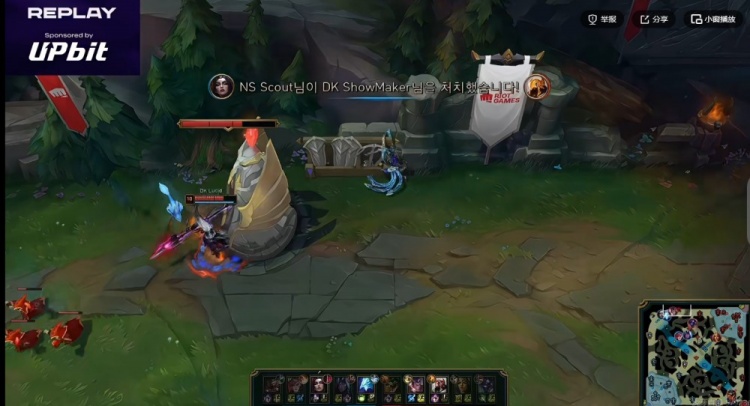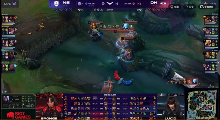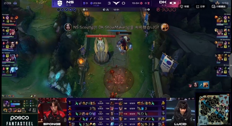 【20:11】DK借助绕后TP眼,五人齐强杀NS下路组,一波0换2稍微打回一点!随后Scout乐芙兰也在中路白给!