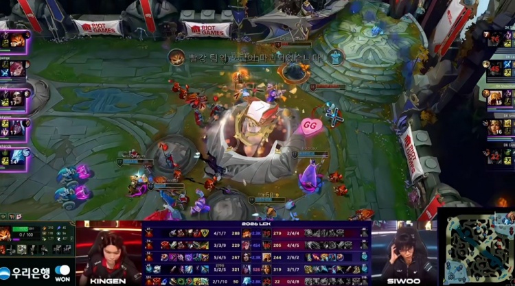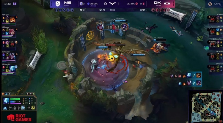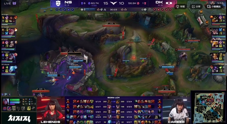 【17:03】Siwoo鳄鱼TP绕后,DK第一波强杀Scout乐芙兰但是有Sponge蔚锁头+先锋车可以拉扯!Scout坐先锋撞了一圈还撞了回来!NS集火逐个击破,没发育好的Smash希维尔根本没输出!最终NS打出1换5团灭DK,拿下听牌龙的同时经济优势已经拉开到了8K!