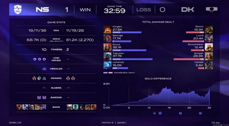 直播吧4月2日讯 2026年LCK第二赛段继续进行中!今天的首场比赛是DK对阵NS!