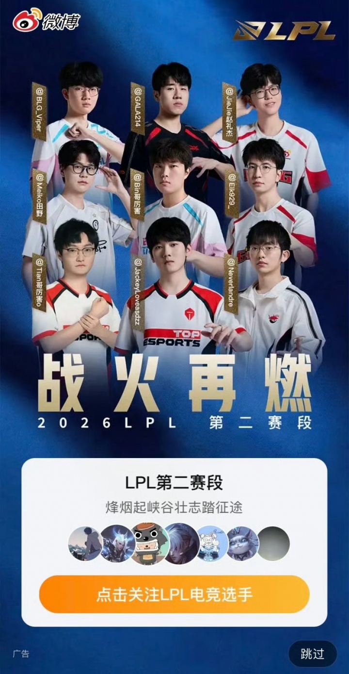 >只有赵大哥没有国际赛事冠军!微博开屏广告展示LPL选手 Bin占据C位