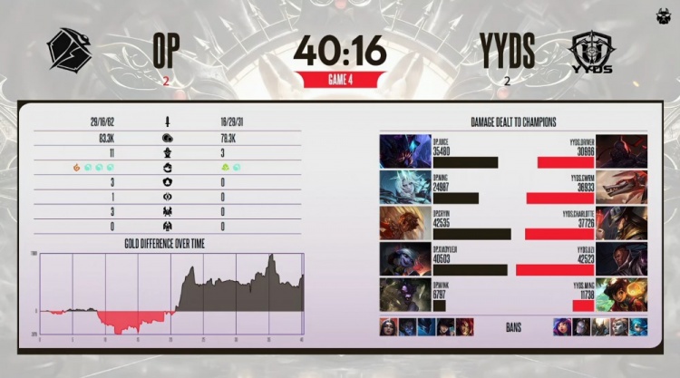 第四局前期宁王佛耶戈多次gank,Uzi队四人越塔击杀xiaoyueji小炮,Charlotte卡牌飞上击杀宁王与Juice雷克塞,小龙团Wink牛头与Uzi卢锡安互换,Uzi队经济领先2k。