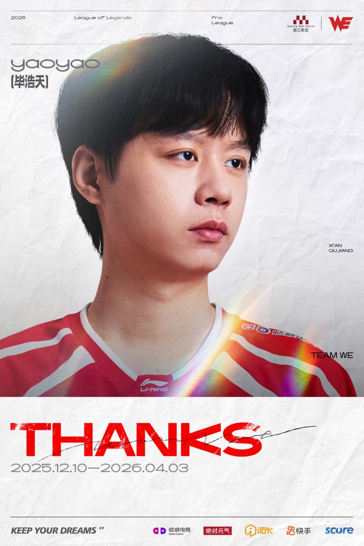 感谢yaoyao选手在为WE效力期间做出的贡献,希望yaoyao选手在接下来的竞技生涯中继续努力前行!