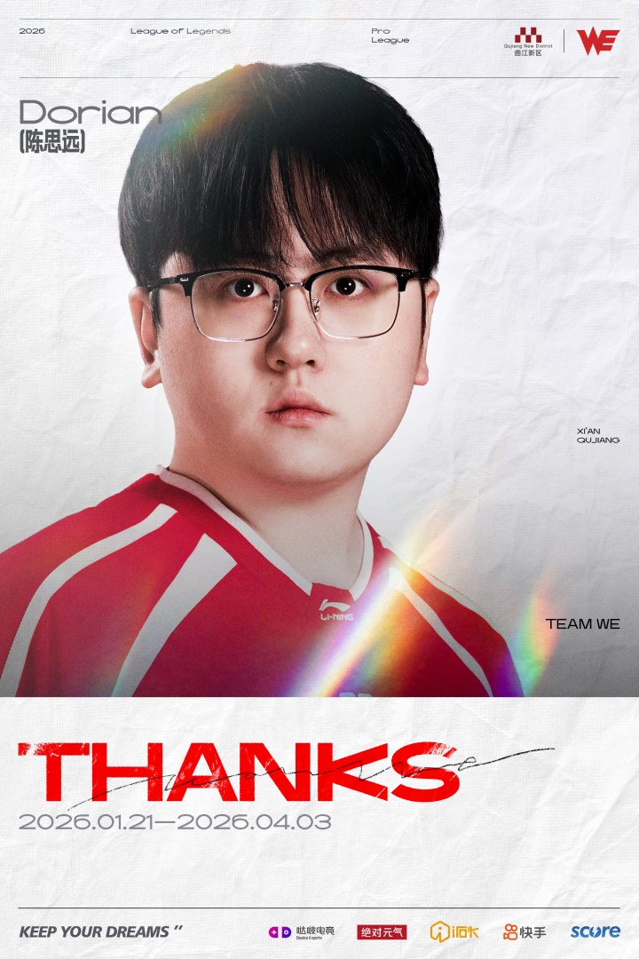 Dorian选手于2026第一赛段中期加入TEAM WE,在队期间一直坚持训练,提升自我,保持良好的竞技状态,与队伍协同一致共进退。感谢Dorian选手的付出与陪伴,希望Dorian选手未来越来越好,在职业道路上一切顺利!