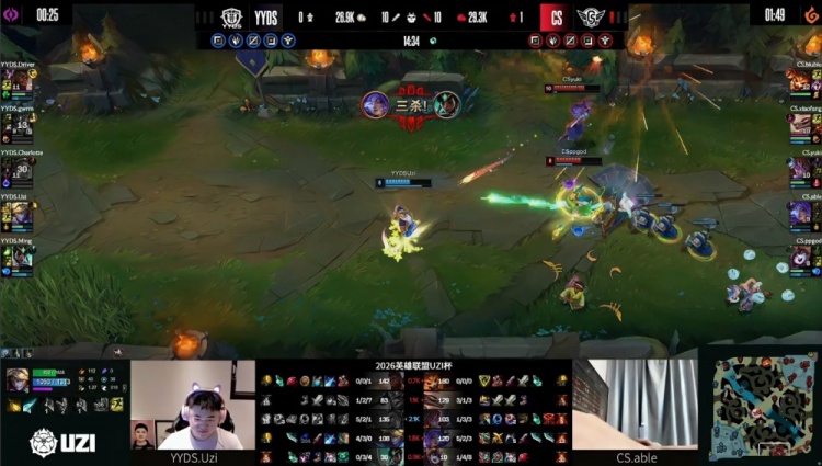 中期双方持续大乱斗,Xiaofang冥犬锁头Uzi将其融化,下路3v3,Able芸阿娜配合ppgod璐璐大招爆轰三杀,但大人头被Ming拿到,Able队打出1换3。野区再度混战,Yuki阿萝拉双杀收割,Able队随后推进放出先锋撞掉Uzi队中路二塔,Uzi队反打2换3,但经济落后5k。