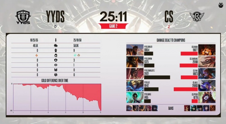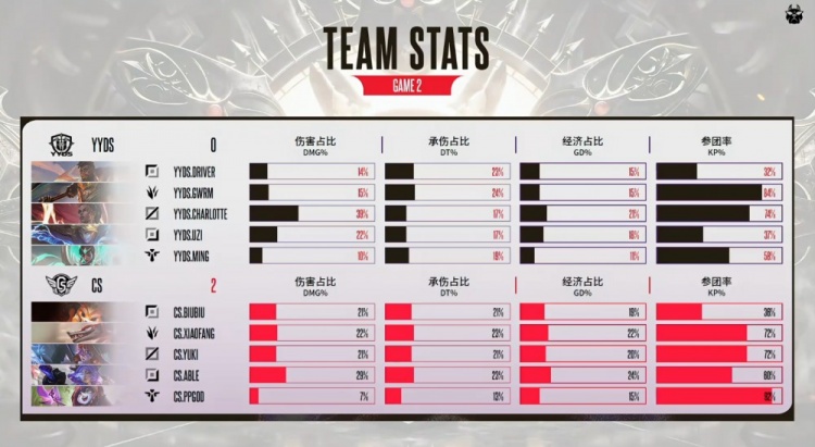 第二局前期双方你来我往人头交替上升,Charlotte梅尔中路单杀Yuki阿萝拉,Able队越下击杀Uzi伊泽瑞尔,打出0换3,双方经济持平。