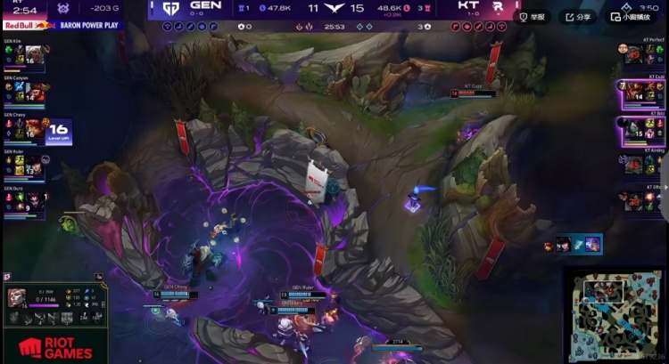 【13:51】小龙团,Canyon猴子转大第一波被Aiming芸阿娜交闪规避,KT反手集火强杀Chovy安妮!Bdd阿卡丽绕后拉扯,GEN拿下小龙但是KT打出1换2,随后Bdd阿卡丽TP包上,GEN强杀Effort牛头但是被KT击杀上野辅三人!KT再打一波1换3+拆掉上一塔,这波过后KT将经济反超!