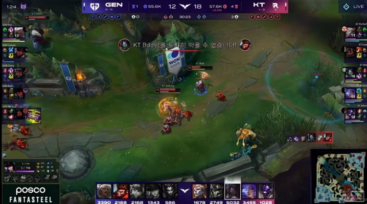 决胜局KT给BDD最后一手选出阿卡丽导致开局自己三路线劣!Chovy安妮更是早早补刀大幅对位压制!中期小龙团KT一波1换2之后又依靠上路Canyon猴子冒进打出1换3,两波团战之后KT反超经济!随后的几波资源团Cuzz皇子+Bdd阿卡丽连续强杀GEN双C,KT赢下小龙团但打大龙犹豫被Kiin安蓓萨游龙了!GEN掉大龙但是换掉了KT三人!