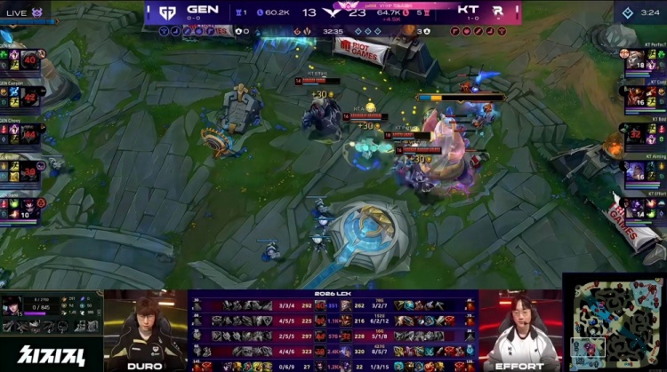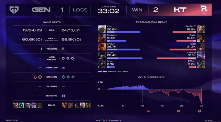 【32:13】中路Effort牛头吃伤害,Bdd阿卡丽绕后想切Ruler女警但是被集火强杀!不过GEN所有注意力都被阿卡丽吸引,正面的Kiin安蓓萨也没了啊!残局Cuzz皇子盖大游龙配合Aiming芸阿娜打满输出!KT集火逐个击破打出1换4!从中路一波结束比赛!击败GEN收下两连胜!