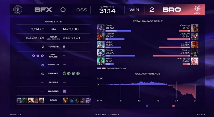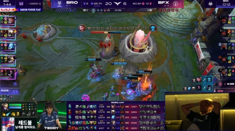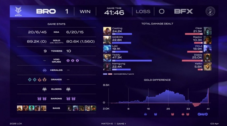 大龙团,Clear杰斯跳进人群先被融化,Teddy伊泽瑞尔带队配合Namgung蜘蛛杀穿BFX五人,BRO打出2换5,三人急忙回家守住基地,BRO吃掉老龙+大龙,一波冲上BFX高地,Teddy三杀收尾,BRO先下一城。