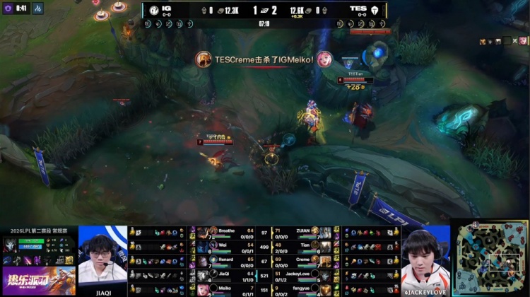 【7:06】小天潘森直接开大飞下落地控住Jiaqi艾希再拿一个人头,Meiko萨勒芬妮被TES三人堵在河道C字草,Creme支援过来拿到Meiko人头,TES打出0换2。