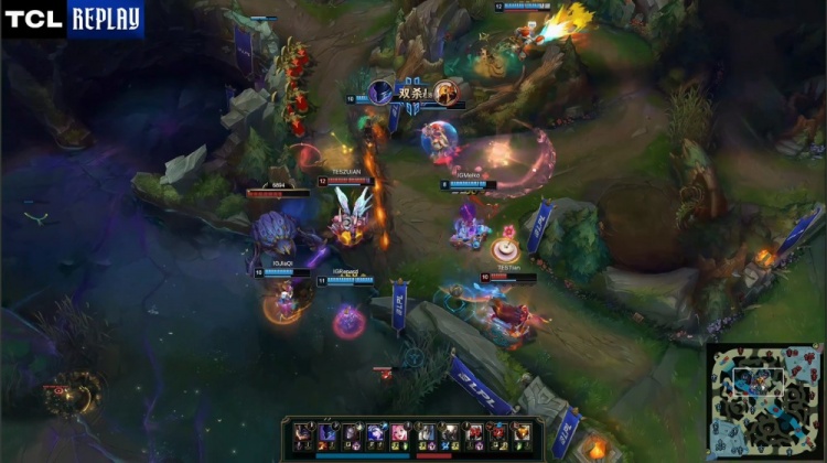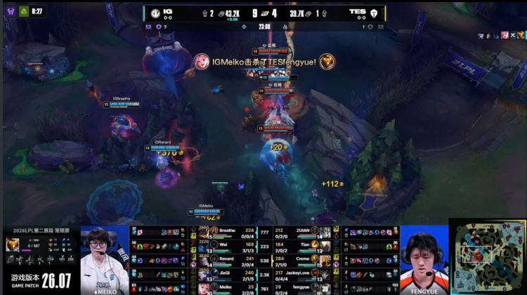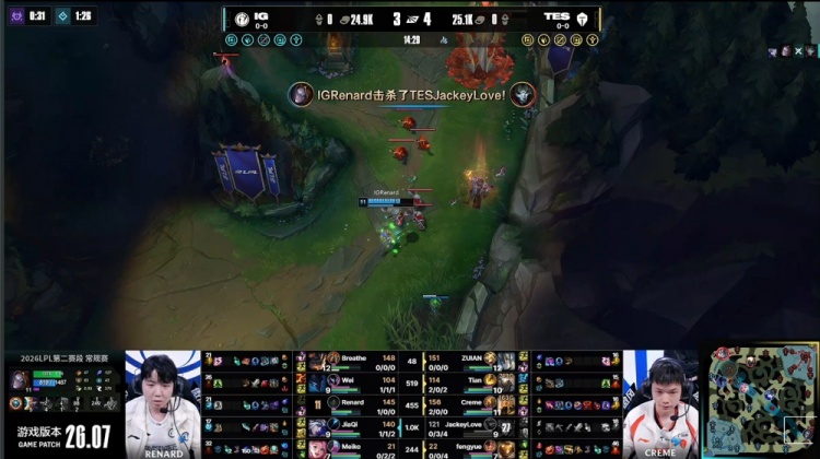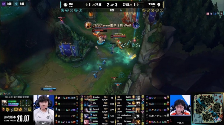 【22:48】大龙团x2,JiaQi艾希侧面闪现出来依然被小天潘森跟上融化,Renard发条与哥哥烬互换,Creme沙皇开戳,双方打出2换2,iG经济领先2k。