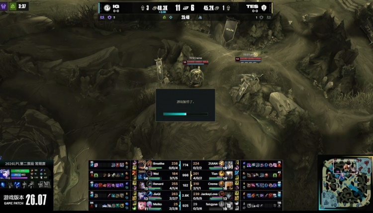 【25:22】fengyue巴德自家野区被Wei梦魇关灯飞脸融化,iG推掉TES中路二塔,经济领先3k,比赛突然暂停。