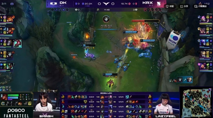 【11:48】DK三人越下强杀LazyFeel伊泽瑞尔,一血给到了Smash烬!