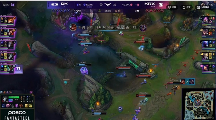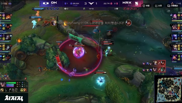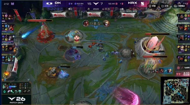 【16:20】野区遭遇KRX先手开团但是Andil妮蔻闪现大招撞墙了啊!DK反打先留妮蔻,随后ShowMaker发条卷大配合Siwoo纳尔拍留住对手两人!这波DK再打出0换3!比赛随后进入暂停!双方经济差接近6K!