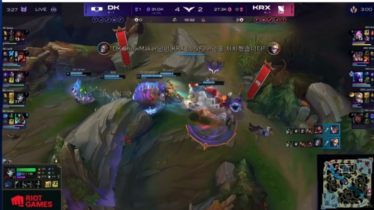 【20:30】小龙团,KRX拿下小龙,DK借助Lucid猴子坐先锋追击+转大强行换掉了对手上路+AD两人!随后又包下强杀Willer赵信!