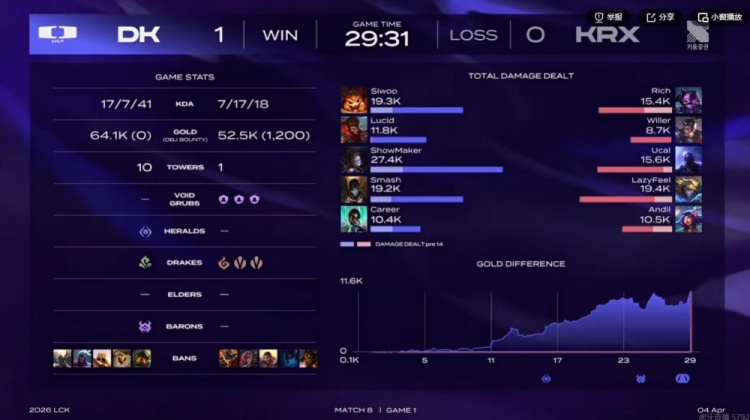 直播吧4月4日讯 2026年LCK第二赛段今天继续,第二场比赛则是DK对阵KRX!