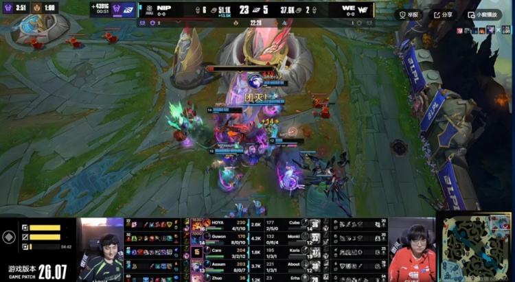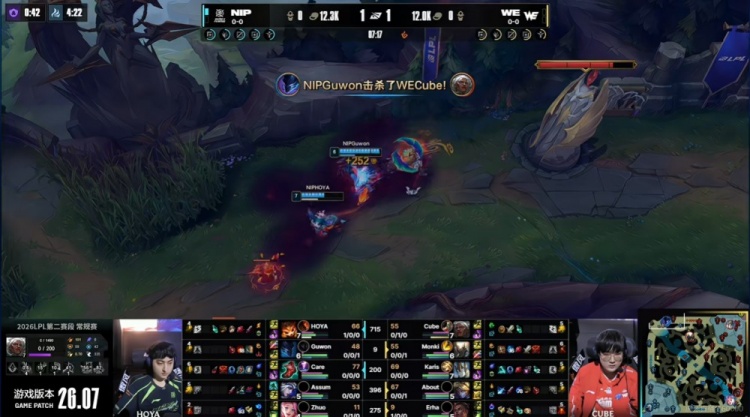 【19:35】WE中路强开但是绕后的HOYA纳尔直接拍回两个!正面Cube安蓓萨进场了就回不来了!NIP正面四个人再打一波0换3,回头直接收下新生的大龙!一万经济差了!